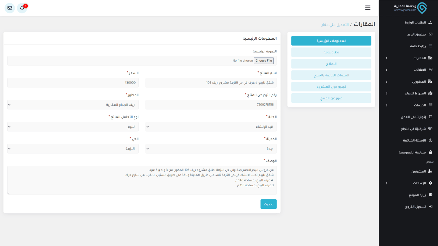 - إدارة المحتوى: تم توفير لوحة تحكم (Admin Panel) مخصصة تتيح للمسؤولين إضافة وتعديل العقارات بسهولة، مما يضمن تحديث المعلومات بشكل دوري وتوفير تفاصيل دقيقة عن العقارات.